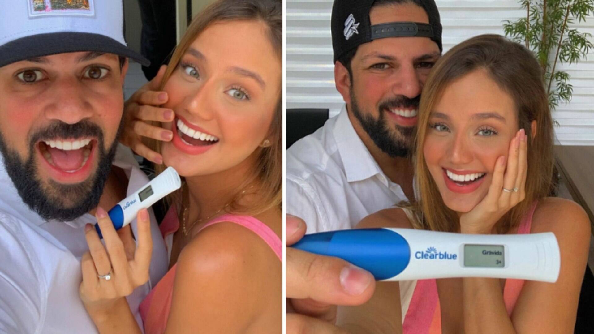 Na rede social, Sorocaba compartilhou um clique em que aparece ao lado da amada com um teste de gravidez que indica que a modelo está com três semanas de gestação.