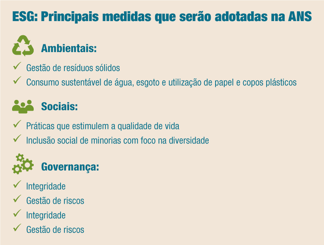 “Com a nova política anunciada, a ANS agrega valores sociais, ambientais e de governança à sua missão institucional. A adoção do ESG contribui com um ambiente socialmente justo, com ações mais inclusivas em diversos segmentos. Dessa forma, pretendemos garantir a implementação de ações socioambientais conjugadas com medidas de integridade,compliancee transparência”, declara Paulo Rebello, diretor-presidente da ANS, destacando que as iniciativas da Agência deverão efetivar a inclusão social com o foco na diversidade, sempre que possível, contemplando as minorias relacionadas à gênero, raça, comunidade LGBTQIAP+, mulheres vítimas de violência doméstica, pessoas com deficiência, entre outras. “Este processo será muito natural para a ANS, uma vez que grande parte desses valores já fazem parte da estratégia e da gestão da Agência”, complementa.