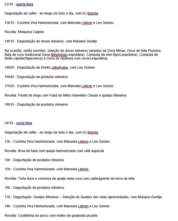 Uma das atrações centrais será a Cozinha Show, que oferecerá aulas e demonstrações gastronômicas ministradas por renomados chefs mineiros, como Manoela Lebron e Leo Gomes. A programação contempla ainda degustações de cafés especiais, queijos, doces típicos, drinks e produtos artesanais, ressaltando a diversidade e a tradição da cozinha mineira.