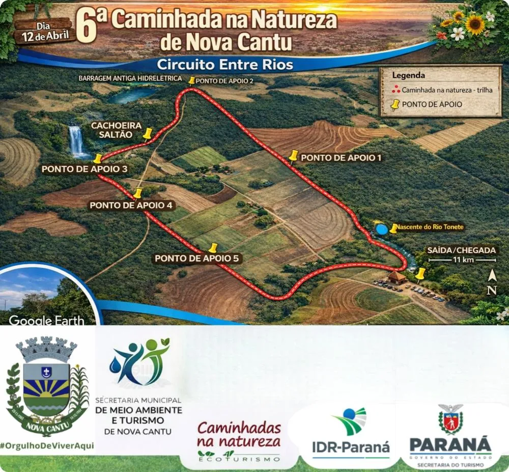 O município de Nova Cantu promove no próximo dia 12 de abril a 6ª Caminhada na Natureza – Circuito Entre Rios. Com percurso de 12 quilômetros, a trilha inclui travessias de rios, cachoeiras, estradas rurais e propriedades do interior, proporcionando uma imersão no ambiente natural da região.