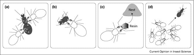 Insetos, no geral, apresentam um sistema imune. Obviamente que cada operária que compõe a colônia terá o seu próprio sistema imune celular, mas não é desta imunologia fisiológica e individual que estou me referindo. Sabe-se da existência do sistema imune expressado em um nível superior, além do fisiológico… da colônia [14, 15], e que não é composto por células. Este é feito pelos indivíduos. Imunologia social é o termo dado por Sylvia Cremer e colaboradores (2007 [17]) para o conjunto de mecanismos fisiológicos, comportamentais e organizacionais empregados em conjunto ou individualmente pelas operárias que compõem uma colônia de inseto social. Da mesma forma que comentamos acima, esse sistema imune social tem funções relevantes para manter a colônia íntegra e individual, assim como bem exemplificado pela fala de William Wheeler. Mas quais seriam esses mecanismos? Como essa imunologia sem células é expressada pela colônia?