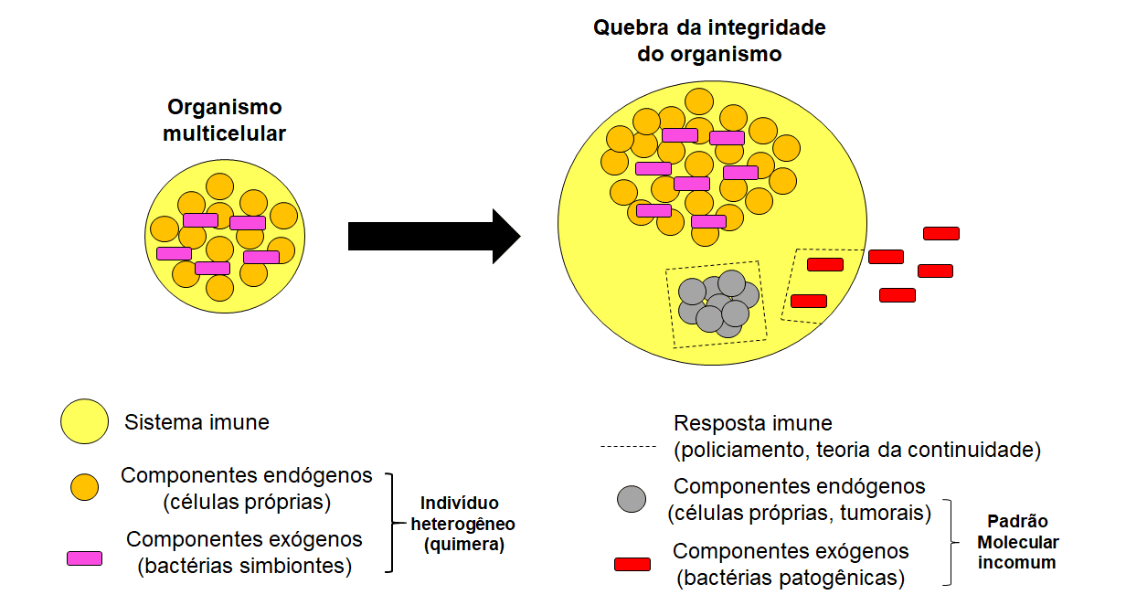 Agora, finalmente podemos chegar a uma boa conclusão e definição do que é o sistema imune, e prosseguirmos com o tópico principal deste escrito. O que incita a reação imune não é necessariamente algo geneticamente estranho ao corpo/organismo, mas sim aquilo que apresenta uma aparência incomum do “padrão molecular”. A isso designa-se a hipótese da continuidade [11], sugerindo que qualquer resposta imunológica decorre da detecção de padrões moleculares que sejam muito diferentes daqueles que o sistema interage, sejam eles de origem endógena (do próprio organismo, como células cancerígenas) ou exógena (como o caso de bactérias e fungos patogênicos, parasitas, vírus, etc). Portanto, um organismo multicelular é composto de constituintes heterogêneos, sendo parte desses originários desde o ‘nascimento’ (células), enquanto outros são obtidos ao longo da vida (i.g., bactérias simbiontes), ao qual a unidade e sua coesividade devem ser estabelecidas. E quem estabelecerá isso? O sistema imunológico!